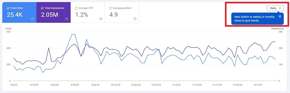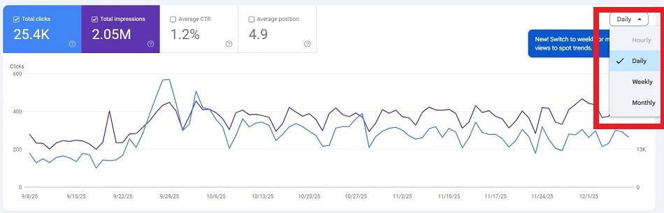 - شناسایی دقیق عامل تغییر: متخصصان تحلیل دادهها میتوانند با دقت بیشتری مشخص کنند که آیا افت یا رشد ترافیک ناگهانی، ناشی از یک رویداد خبری خاص (در نمای روزانه) بوده یا حاصل اجرای یک استراتژی سئو محتوایی در طول یک ماه (در نمای ماهانه).